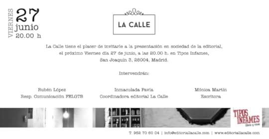 La editorial con la que publico mis dos nuevas novelas, La Calle, está aún en pañales y será el próximo viernes día 27 de Junio cuando salga al mundo y vea la luz. Para ello, se ha preparado un evento en la librería Tipos Infames de Madrid donde además de charla literaria habrá unos vinitos. Yo, que soy muy de improvisar sobre la marcha, igual me saco un billete de AVE barato y me planto allí, así que si queréis verme en persona, que os firme algún libro o comprar antes que nadie Riku desde los Infiernos o La Inquietud bajo la Piel os dejo la invitación.