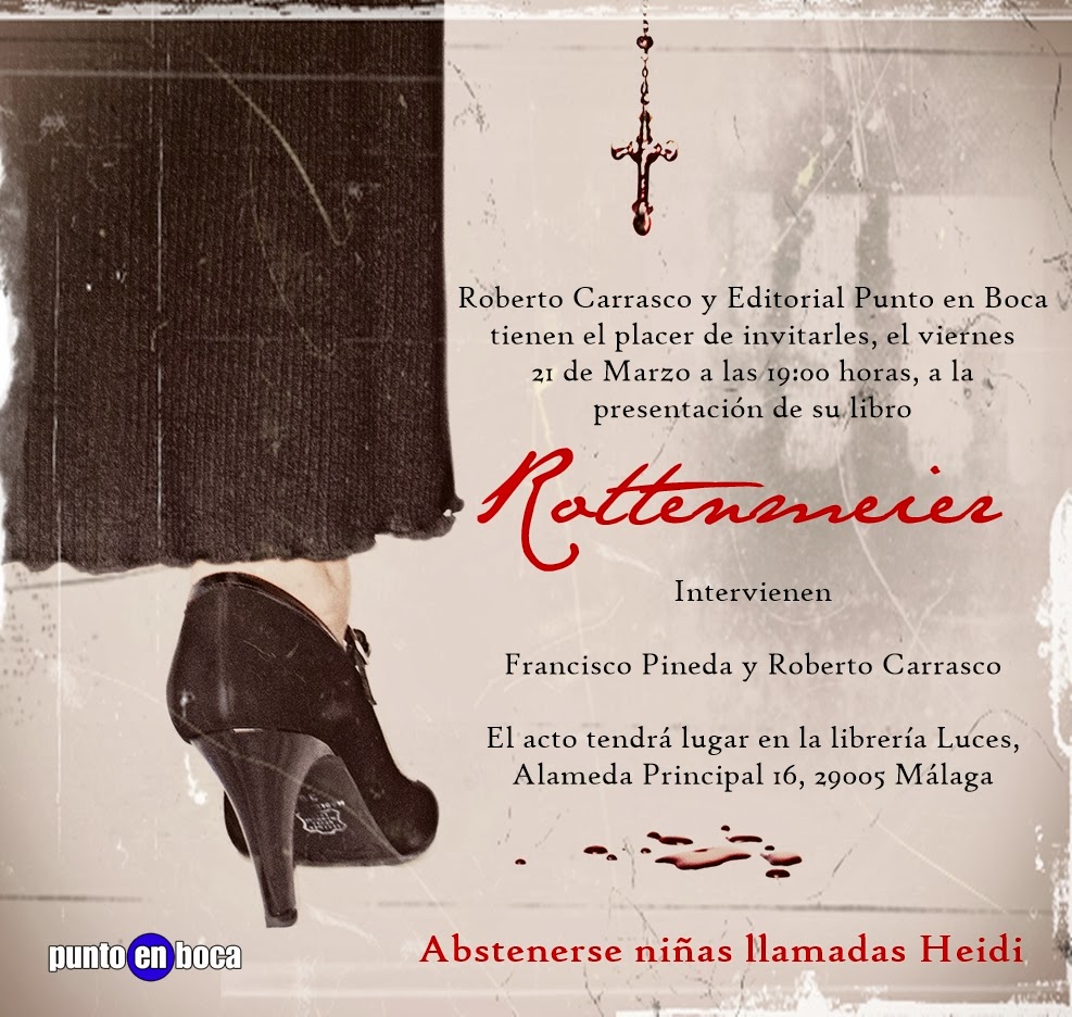 Sois muchos, cada vez más, los que me escribís pidiendo consejo o enviándome algún texto para que os dé mi opinión. Me gustaría tener todo el tiempo del mundo para atenderos adecuadamente, pero no siempre es posible. Por ello, daré una charla, que espero que sirva de inspiración, en la UMA el día 22 de Abril (si no hay cambios, será por la mañana) donde daré, desde mi experiencia, un montón de trucos para todo aquel que quiera tomar su vocación por las riendas y escribir de una vez por todas una novela (a poder ser, publicable). Por lo tanto, si estáis en Málaga ese día, os invito a que os paséis por el salón María Zambrano y a que os unáis a esta "iniciación" en la escritura y el mundo editorial. También estaré firmando ejemplares de mi última novela, Rottenmeier, que podréis comprar allí mismo si aún no la tenéis. ¡Espero veros a todos! Agradecería la difusión de este acto a través de las redes sociales.
