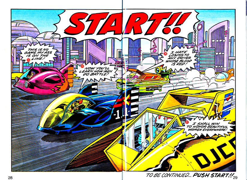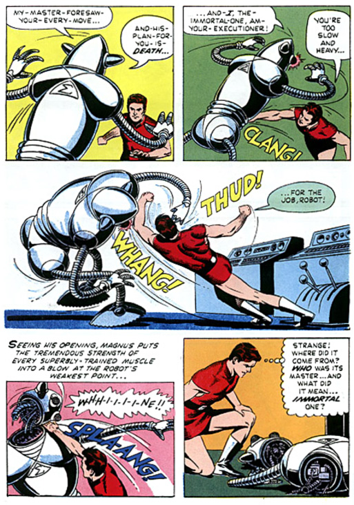 NO ONE LOOKS AT THIS PANEL AND GUESSES THAT THE RED GUY IS MENACINGLY STALKING TOWARD THE SMALL AND WIMPY LOOKING KID. THE RED GUY IS SUPPOSED TO BE MUCH BIGGER THAN THE KID AND BODYBUILDER-MUSCULAR, BUT YOU CAN'T TELL THAT HERE. NO ONE WOULD GUESS.