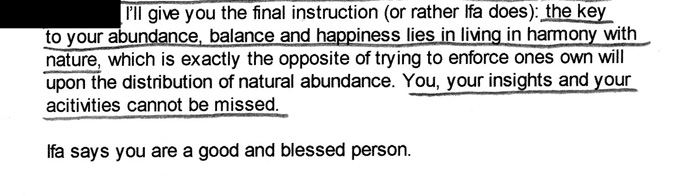 The divination, more of an analysis of one's life and specific instructions for how to improve it, actually, was interesting overall and amazing in places.
