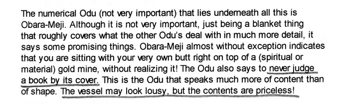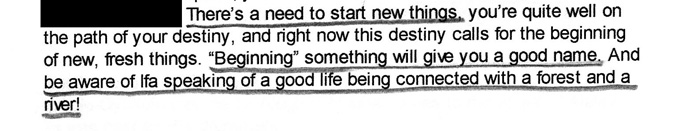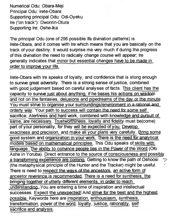"This client has the capacity to survive just about anything…." Yes, I guess I'm a survivor. "This Odu speaks of skills with the language." Hah! Lord knows I try.