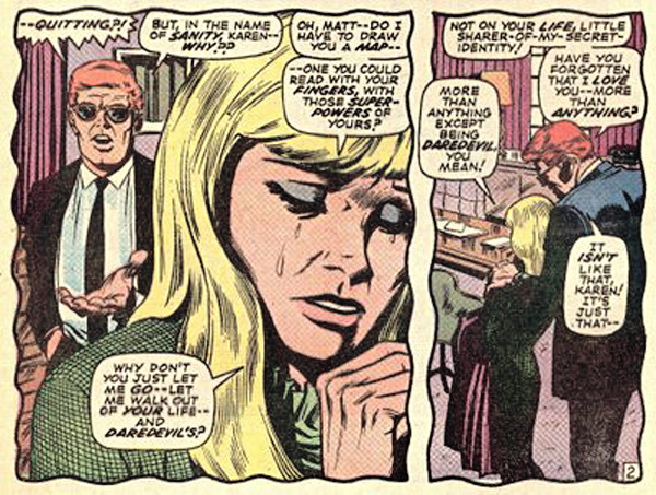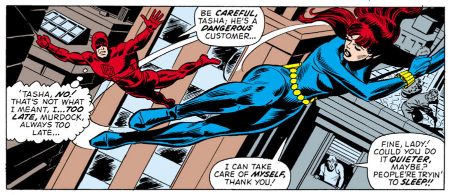 "Totally off-topic, I've been reading some old Daredevil tales from the 1960s/70s and was surprised at the "limp" way the female characters were presented. Both Karen Page (in particular) and the Black Widow are from the "Oh, Matt..." school. Any thoughts? (or kick me into the place where I SHOULD have posted this) - MmM "
