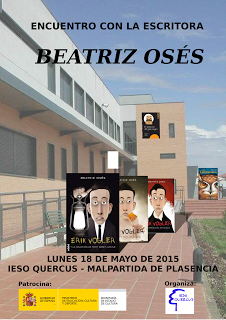 Dentro del programa de "Encuentros literarios" del Ministerio de Educación y Cultura, tengo previsto acudir mañana al IESO Quercus, de Malpartida de Plasencia y charlar con los alumnos de los distintos niveles de la ESO que han leído: "El misterio del gato negro", "Erik Vogler y los crímenes del rey blanco" y "El cuentanubes".