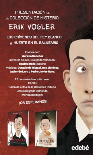 Ya falta menos para que aparezcan las dos primeras novelas de Erik Vogler. Aquí os dejo un pequeño adelanto de esta colección de misterio que se publicará en otoño, en el mes de noviembre, en la editorial Edebé. La imagen pertenece a la cubierta del primer libro, ilustrado por Iban Barrenetxea, que lleva por título: "Los crímenes del rey blanco".El segundo libro con las peripecias de este friqui de Bremen se titula: "Muerte en el balneario" y también está ilustrado por Iban Barrenetxea.
