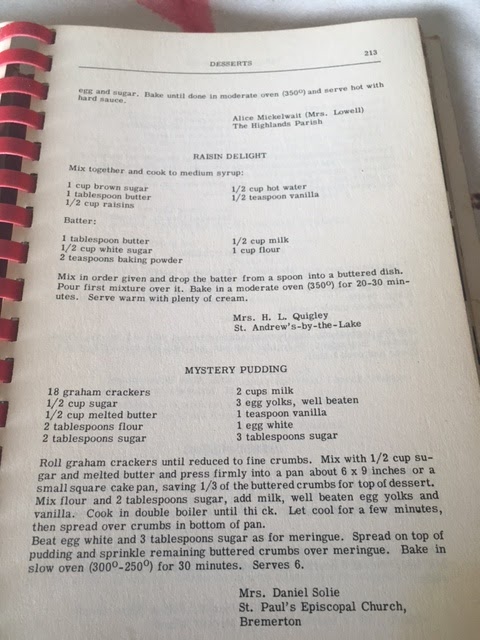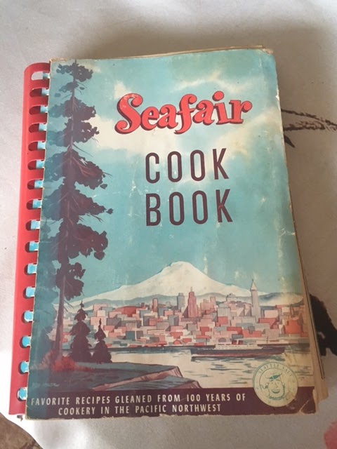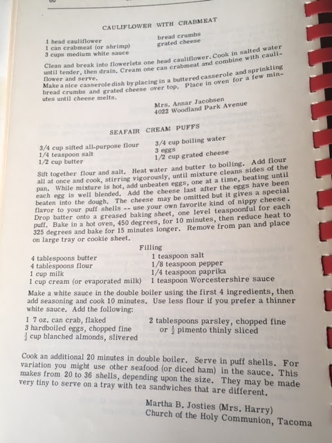 Notice they've got Mount Rainier on the cover and not the Space Needle - because the Space Needle wasn't built till 1962.The recipes are pretty amazing. Many require the use of gelatin, and more than a few call for a handful of this or a little of that. Scanning the index, I saw a section of "cocktail" recipes and got all excited (because '50s + cocktails!), but they turned out to need shrimp and avocado, not bourbon. Oh well. There's a separate chapter for recipes contributed by men, one for holiday recipes, one for historic, and one for foreign recipes. Fun stuff!