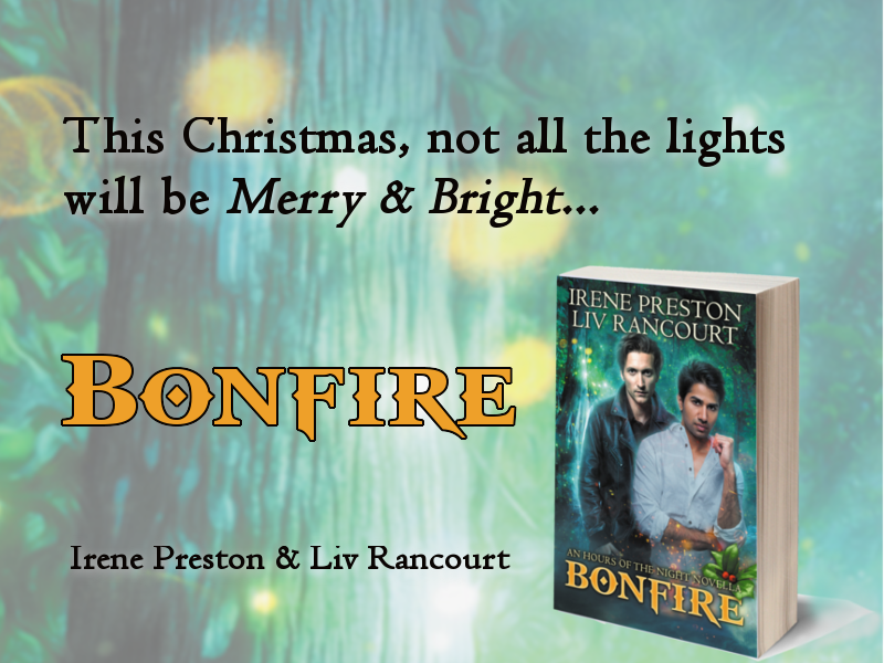 Russell's got some work to do before his two weeks in Seattle are over, don't you think? Hopefully I'll soon have some good news about Aqua Follies and you can read it for real. In the meantime, Irene and I have another giveaway running to celebrate the release of Bonfire, our m/m paranormal holiday story. If you want to learn more about Bonfire, jump HERE.