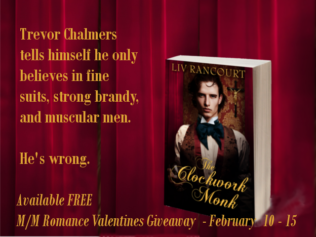 Trevor Chalmers tells himself he only believes in fine suits, strong brandy, and muscular men.He’s wrong.BLURBThe Clockwork Monk is a mystery the President herself asks Trevor to solve. She wants it, and Trevor’s her spy. An encoded message leads him to the residence of the Archbishop of Chicago, where his undercover role allows him to indulge in fine waistcoats and fancy cravats. Even better, he enjoys the thrill of dodging both anarchists and propriety while engaging in a duel of secrets with the mysterious Father Stephen.The good Father doesn’t act like a priest. Hell, Stephen may not be his real name. His broad shoulders and dark eyes are intriguing, and though Stephen’s clandestine agenda clashes with Trevor’s, danger just adds to the temptation. Between kisses, Stephen forces Trevor to admit his loyalty goes deeper than cheap excitement, turning a simple burglary into a test of his allegiance.Interested? Jump HERE to see all the Freebies!Happy Valentines Day!