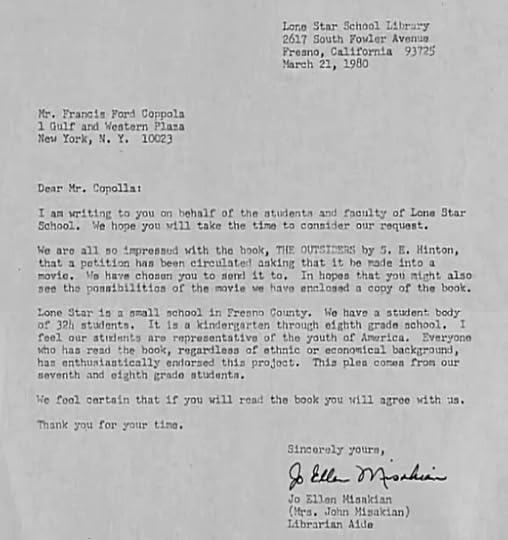 In middle school, one of my favorite books was The Outsiders by S.E. Hinton. I must have read it twenty times. Then I found a copy of the VHS and watched that repeatedly, too. There’s a lot of argument pitting books against their movie versions, and for The Outsiders I loved both. So it was awesome to see today’s Letters of Note, in which a school librarian and her students helped bring The Outsiders to Francis Ford Coppola, who ultimately directed the film. The first letter: