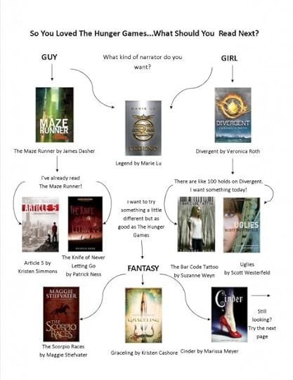 My mom read The Hunger Games recently and afterward she told me, “I don’t even know what to do. What else can I read that’s like that?” I suggested The Handmaid’s Tale, which might have been a little too intense for her. (Sorry, Mom.) I should have directed her to the Lawrence Public Library’s flowchart for what to read after The Hunger Games. A sample: