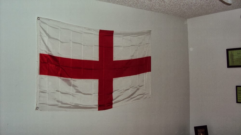 Well, since the England football team beat Poland 2-0 and now qualify for the 2014 World Cup in Brazil, it's time for my 6-foot X 3-foot English flag to go on display! PS: For non-Brits who are thinking "That's not the Union Jack." No it's not! The U.J. is the British flag, but the red cross on a white background is the English flag - which is very different! And there it is, in all its glory!
