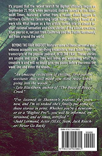 BEYOND THE FRAY: BIGFOOT features some of these personal eyewitness accounts and terrifying encounters, most taken from the transcripts of the popular podcast, INTO THE FRAY. These stories are unique and scary. They will leave you wondering what this creature is and will no doubt give you pause before you cross the wood line and enter the woods.