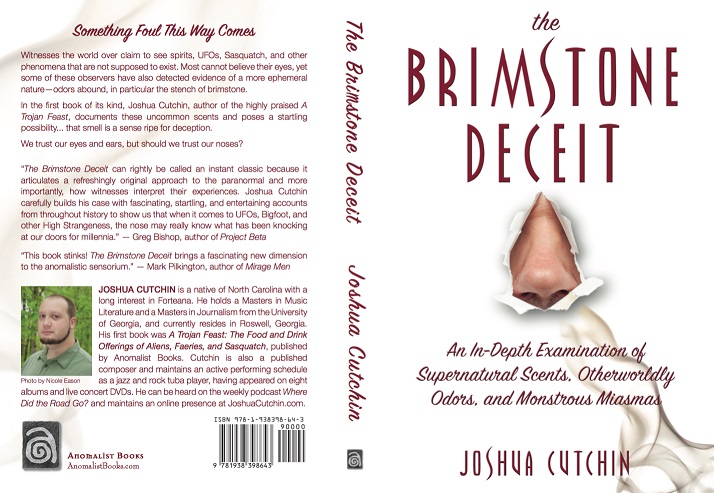 Available right now is the new book from Joshua Cutchin, The Brimstone Deceit . Its subtitle: An In-Depth Examination of Supernatural Scents, Otherworldly Odors, and Monstrous Miasmas . You may recall that in May 2015 I reviewed Josh’s previous book, A Trojan Feast . You can find the review here . In many ways, the two books are of a similar nature. Whereas A Trojan Feast was focused on the connections between Fortean phenomena, strange entities and food, Josh’s new book revolves around odors and the world of the unexplained.
