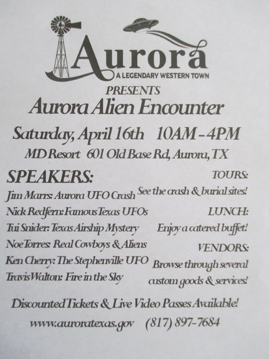 For those who may be interested in attending, I'll be speaking at the first Aurora Alien Encounter conference in Aurora, Texas on Saturday April 16. And here's the flyer, which shows all the info on the event.