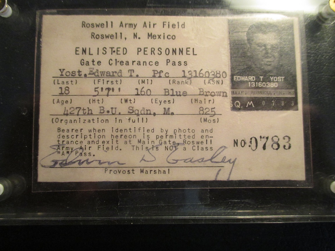 Check out too the "gate clearance" card for access to the old Roswell base way back when. You'll see the signature is that of Major Edwin Easley, who - as Provost Marshal - was one of the central figures in the Roswell crash saga.