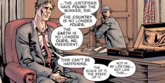 In this scene, a man with the president (for some reason wearing a fedora in the 2000s), warns that Darkseids forces, brainwashed humans and superheroes called justifiers, are about to wipe them out.