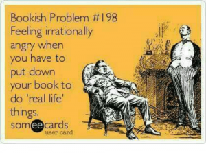 It’s weird how little of what other readers think is “relatable bookish content” doesn’t apply to me at all. I don’t have problems with a massive backlog of books in my to-be-read pile, as I typically only buy books when I am ready to read them. Right now my backlog is the largest it’s ever been: four books, one of which I’m currently reading, and three I’ll read before the end of the year. The only reason I even bought four books at once was because I found them while traveling and I didn’t know if I’d be able to pick them up locally. I don’t lose sleep over exciting books–though I have grouchily stayed awake until the next scene break or the end of the chapter, just so I’m stopping in a good place. And I don’t have issues with putting my reading habits aside to take care of other things.
