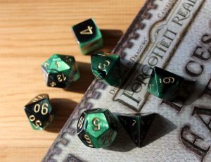 I mentioned as much when I shared photos of my story dice, which I use for creating prompts. I occasionally use those for getting stories un-stuck, too. But most of the time, I use my regular D&D dice sets for my writing. A friend asked how I made that work, so I figured I’d summarize what I told him here, just because others might find it interesting.