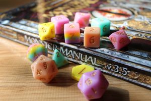 Through the month of August, I shared some photos of my modest dice collection on social media. I never had an opportunity to gather dice like my friends; living where I did, there was absolutely nowhere to get them, and I’m a tactile person, so I like to see and hold them as a part of picking out what I like. Plus, photos rarely do them justice. Many dice don’t photograph well. Either they look way better in person, or the colors captured can be way off. That said, my ultimate dice wish list would include a set of gemstone dice. Labradorite, to be precise. I probably won’t ever find those in person, so that’s a someday purchase where I’ll take the leap and buy online.