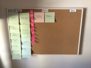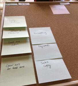 eing pages and pages of stuff left undone was daunting. To make the job a little more palatable, I decided to put up a Kanban board next to my desk. I had a corkboard from Ikea I hadn’t hung yet, so I popped it up on the wall above the (currently malfunctioning) printer and filled it with color-coded post-it notes. The idea behind the board is to have each note represent one task–one small step in the bigger process of publishing. The left-hand side is filled with things I need to do, the middle area is for things in progress, and the right-hand side is for tasks that are complete.