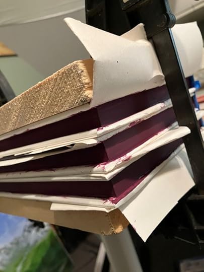 The concept seemed pretty simple: wrap the covers with paper, tape the edge of the spine, clamp the books between boards, and paint. Well, I already had everything needed for the project, so I figured it would be a great opportunity to practice by making some special hardcovers as thank-you gifts for the wonderful beta readers that helped me develop The Witch and the Wyrm.