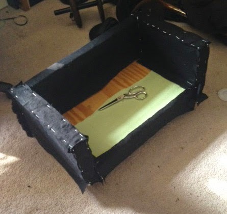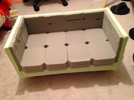 The next step was adding a little padding to the outside, and a lot to the inside. I had some great foam saved from boxes that came from the local Apple store, which I hot glued to the inside of the back and sides, then glued scrap fleece to the outside for just a little cushion. I also created removable seat cushions by layering the foam pieces together.