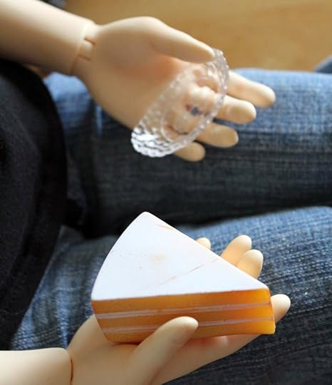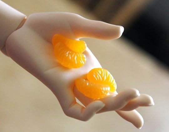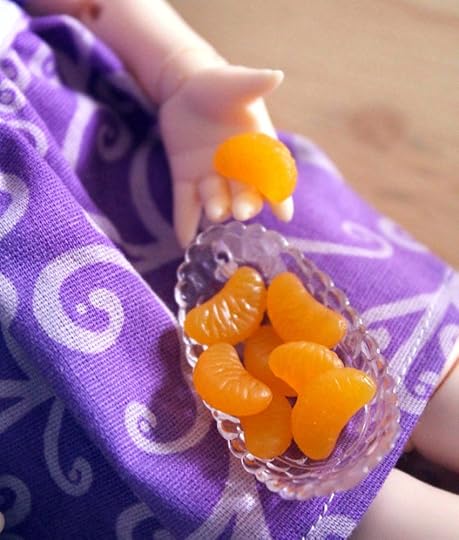 The detail on the slices is great and unlike many of the pieces I got, they’re detailed on both sides. As a result, I think I’ll be keeping them loose instead of putting them on top of the cake slice like I originally planned. They’re actually very pretty to look at, beautifully translucent. They look like normal orange slices in a YoSD’s hand, and look like mandarin slices in the grasp of my larger dolls, like my F65 below.
