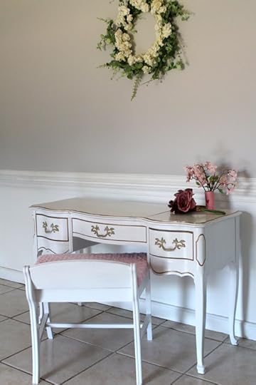 So the hunt for a desk began. I collected artificial flowers for the space while I hunted for just the right desk. I knew what I wanted–something French provincial to nicely accentuate my china hutch, something that would work well for both me and my daughter so she could have somewhere dreamy to do her homework, too. She even asked for exactly that, particularly after the night I dragged a 12 foot long branch into the house and cut it to fit in the corner.