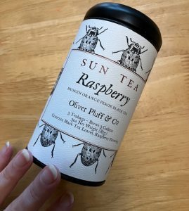 Now that I’m thinking about it, I’m not sure why I’ve never made sun tea. And let me tell you, the bags for a whole pitcher of tea at once are huge. This one is raspberry sun tea from Oliver Pluff & Co. From the can alone, I had a feeling I’d like it.