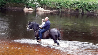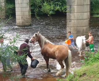 Normally the horses would be 'swum' in the deep parts of the river. Not this year though. This stallion, with his man and boy, was just pludging around in the shallows.