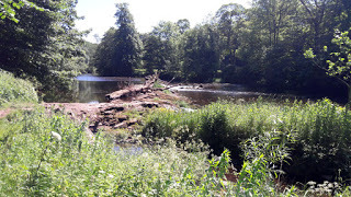 The river, still decorated by the corpses of winter trees, is flowing steadily over the weir as it usually does in summer. The mill pool is mirror-still except for the ripples made by fly-catching brown trout, and the banks are yellow with Mimulus and the purple and white shades of Dame's Violet.