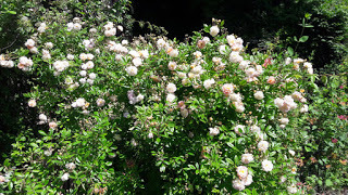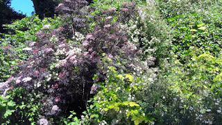 The Rambling Rector is gambolling happily up the cliff and through the pink elderflower, competing busily with the golden hop (which has abandoned the garden and gone feral!).
