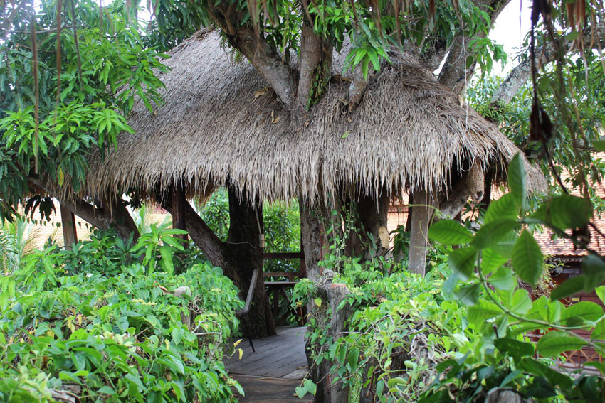But there’s another story here too – a view you can get from the tree house. Behind the hotel are a series of overgrown plots, some of several acres, with big wrought iron gates and burned out villas inside. They have not been re-colonised, except by the thin, white cows that wander freely here, and they remain as a grim reminder of Cambodia’s recent history.