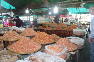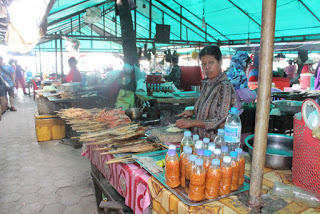 There are also piles and piles of shrimp in the market – most of it caught by damaging methods – either electric fishing or bottom trawling. We don’t buy any. There is also a political twist to this fish market. A lot of fish is caught in Cambodian waters by the Vietnamese and sold back to the Cambodians at Kep and Kampot, which causes a great deal of friction.