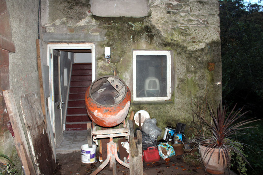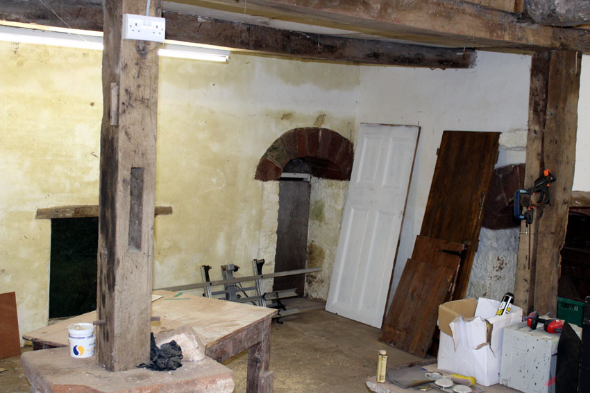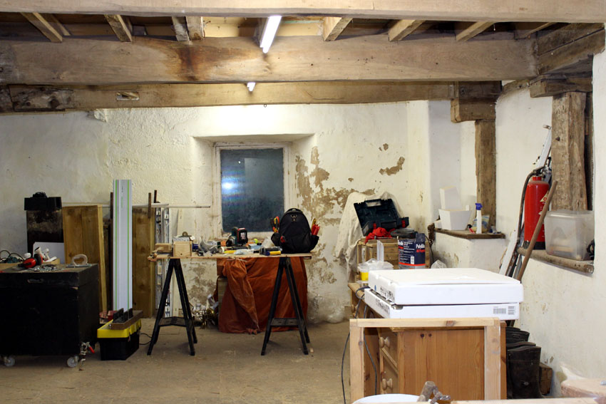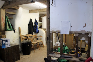 Inside our little cottage the floor, at least is done, though kitchen worksurfaces and shelving, windows and doors have yet to be restored. As much as possible is going to be high up on the walls.