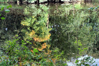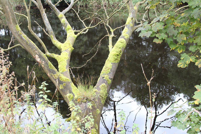 Then there were trees, leaning precariously out over the water; trees that have died, but not yet been swept away by the floods. Some of them have been colonised by moss and grasses. I wonder if this one will still be there in the spring?