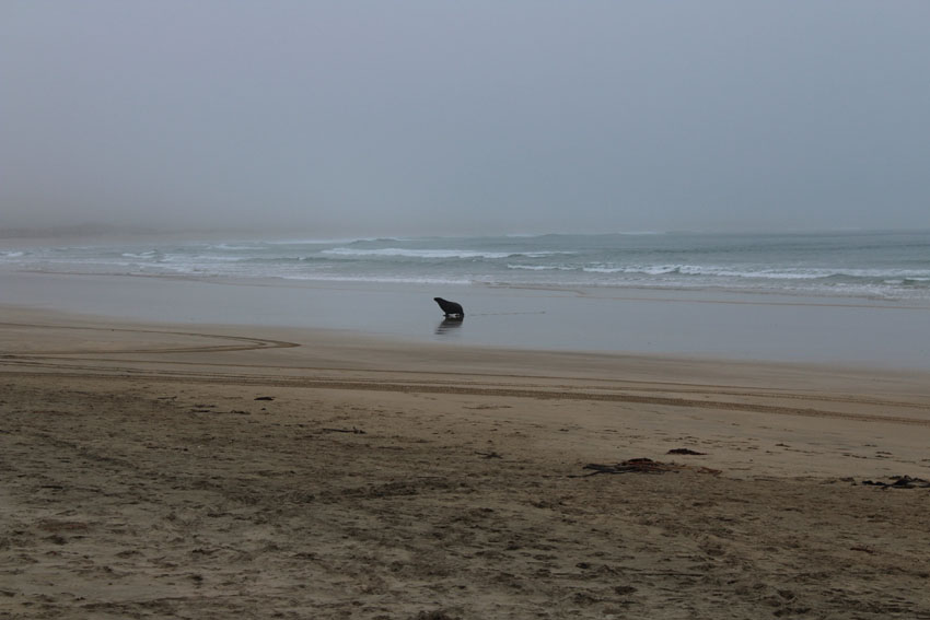 Beach with sea-lion - the view from my bedroom windowThe Southland is very beautiful - hills and wild bush, remote sheep and cattle stations, small communities, fast-flowing rivers, waterfalls, and miles and miles of stunning coastline. You can find places where you can't hear human activity at all. We rented a 'bach' directly on the beach of a small bay with the sea in front of us, and Manuka forest and virgin bush behind us. Only the sound of the waves and the birds.