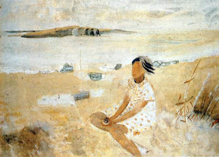 Scotland. The sea looking across to EiggI was also aware, working through her work chronologically, that there was little sense of development of her art during her lifetime - no feeling of talent being pushed against limits. Nor did the paintings seem to represent the feisty, articulate, very solid character that is apparent from words and photographs. I wanted these pale and fragile images to be much more.