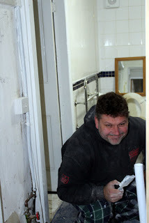 Upstairs the ravages of damp, mould, and the re-wiring, are being repaired. This is my wonderful son-in-law, Ian, who has come to help. Way to go yet, but at least it's begun!