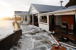 Wellington, despite being in a sheltered harbour, is famous for its storms, but Days Bay and the beach-side houses have always been safe. The worst storm in 117 years had only broken a window. But in 2013 a mega-storm wreaked unprecedented destruction. The little cottage, now altered for modern use, but still a site of pilgrimage for Mansfield readers, was almost completely destroyed. The current owners described a night of terror. "My dad got up at about 12.45am after he heard a window smash. He went to the front door to get a piece of plywood and saw there was a lot of water building up around the house. He went back inside to get Mum, and a huge wave took out the dining room window, so they grabbed the dogs and made a run for it to the neighbours." When they came back next morning, “pretty much everything had been washed out by the sea.” This is what it looked like.