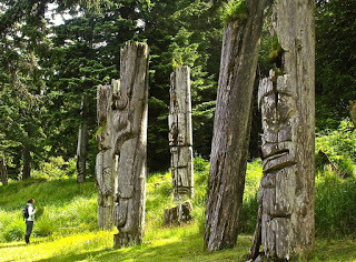 The Mortuary and Memorial poles of Ninstints, Haida GwaiiWatching Jago Cooper canoeing round the coastal inlets and tramping through ancient woodlands made me very nostalgic for Haida Gwaii, Cormorant Island and the many other places I visited. I longed to go back. He met many of the people I met too - Haida artists and carvers, museum curators. But he stayed well clear of the politics. The daily fight for their landrights against oil companies and forestry corporations was barely touched on. But he did, in Programme 2, confront the genocide perpetrated by the government of British Columbia which left only 500 out of 30,000 people on Haida Gwaii alive. It is a tribute to the strength of their culture that they survived. As their declaration in the preamble to the Haida Constitution affirms: