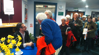 Paul Mason (whatever it says on the board) and a long queue to sign books. Photo Gwenda Matthews at BookendsBut the final event of the day, at the end of the Festival, was Ben Okri talking about storytelling. It is, he said, fundamental to the human psyche, pre-dating, perhaps, even our use of tools and technologies. As soon as human beings had language, they had story. He talked about the 'transgressive' quality of stories and the mysteries at the heart of them. "Stories are never what they seem. They are whispers from beyond the invisible screen of existence." He talked about the importance of the imagination and allowing children creative play. "Imagination dreams that which knowledge makes real . . . A people can only create what they can imagine."