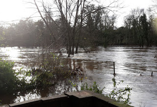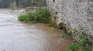 I woke just before dawn on Sunday morning, in a strange bed, listening to the rain on the windows. It had rained for more than 24 hours and I dreaded to think what I would find at home. I got up, dressed as quietly as possible (my friends were asleep) and slipped out of the house. The weather was still fairly wild, but I could see, as I walked down the lane in the early light, that the river had gone down just a little. I climbed back into the Mill through my neighbour's garden. The electricity was off, but I had a torch and could see that the building was standing, though there was still the eerie sound of water sloshing around below me. The river had retreated from the Mezzanine floor, but was surging through the ground floor, several feet deep, at speed. I felt considerable relief that it hadn't been worse. At some point in the night the amount of rain falling and the rate of the river taking it away had obviously achieved some kind of equilibrium.