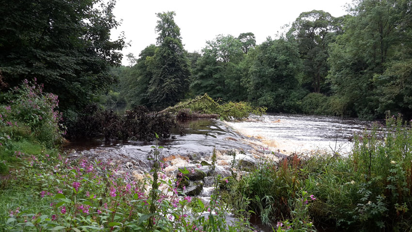 This morning there are three trees washed up on the weir and the river looks like Guinness.