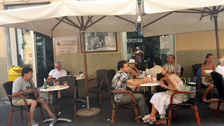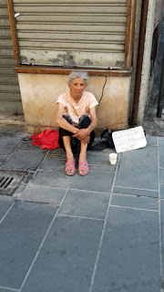 Dazzi’s is the posh patisserie in our wealthy little town, and next to it there is a shop that has recently closed down (another clue to the state of things) and outside it today an elderly woman, thin as a stick, begging. She may be from Romania or Albania, but one thing is certain, she doesn’t have any money and the police will quickly move her on. This is the tourist season and they don’t want the rich tourists to get the wrong impression - or be hassled for their small change. The police had a big clean up a few weeks ago, but gradually the dispossessed are building up again. And yes, I did have her permission to take the photograph.