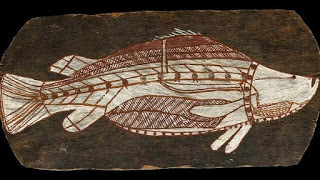 A haunting painting from Indigenous AustraliaThe curator, Gaye Sculthorpe, is herself of Tasmanian aboriginal ancestry and she defends the exhibition on educational grounds. And it certainly is educational. 'Aboriginal art represents one of the longest unbroken art traditions in the world,' writes the curator, and the Australian tradition is one of the oldest. It goes back at least 40,000 years. There are some early artworks in this exhibition, drawings in red ochre on tree bark, like this Barramundi fish, whose anatomy is very carefully drawn.