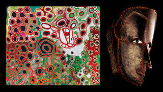 There were beautiful masks, including crocodile masks for ceremonial wear, but because photography was prohibited, I'm restricted to showing only the advance publicity photographs for the exhibition. This mask is from the Torres Island community, alongside a contemporary painting.