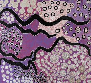 The artworks are tied, inextricably, to the 'country' of the indigenous people, which is so much a part of their lives as to be one with them - there is no separate word for it, because it is part of themselves. One artist writes that, "Removed from the land, we are literally removed from ourselves." There is a very moving paragraph by Tania Major, one of the Kokoberra people of Queensland, that attempts to explain the relationship. "If you can imagine then, one family continuously occupying the same land for 40,000 years or more, using it not just to sustain life, but as a place of reverence and workshop, where every tree, rock and water hole has significance, you will get some understanding of the importance of land to the Indigenous people."