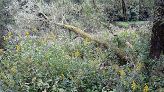 One of our riverbank willows has snapped off and is lying horizontally over the river, ready to be washed away the next time the river is in flood. It's lying among the drifts of Yellow Loose-strife and Himalayan Balsam that are blooming chest-high at the moment.