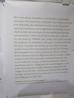 Many of the children refused to be broken. Two little boys stole a rowing boat and managed to row to another island. There's a heart-breaking exhibit of two keys made from sardine tin openers that were made by enterprising children to break into the school's locked food stores. And there was also, among all the terrible testimony, the underlining of the power of story-telling. In every dormitory there was always one child who would risk punishment to tell the traditional stories and keep them alive. 'There were always storytellers', this woman says.