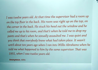 These schools were known as 'the Schools of Sorrow'. The speaking of aboriginal languages was banned, and the personal testimonies of survivors (more than 50,000 children died) makes grim reading. They were subjected to abuse; physical, sexual and psychological. They were under-clothed, under-fed, ill-treated, and subjected to excessive, often sadistic, corporal punishment. Many are now deaf or suffer eye and breathing defects because they were repeatedly hit over the head. Some lost limbs from frost-bite from being shut outside in winter as a punishment. They can now claim compensation, but no amount of money can ever compensate for what they suffered then and still suffer now.